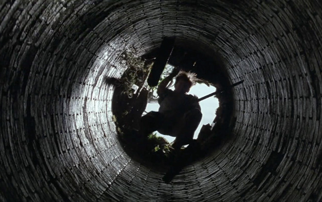 Bruce cai ao poço em "Begins" / Bruce trepa o poço em "Rises" - o primeiro acto e o último ano da trilogia, numa das muitas conexões entre as três películas