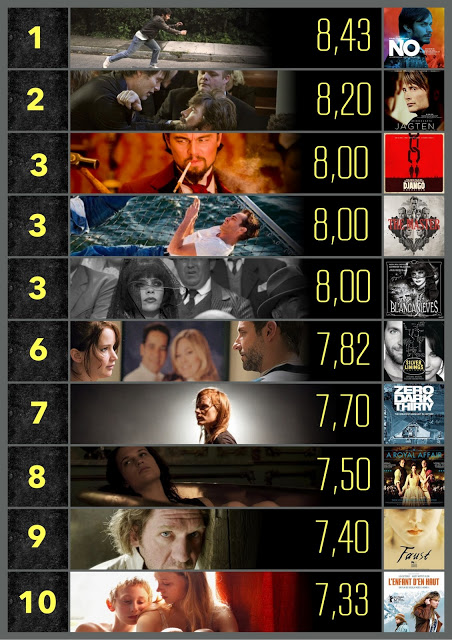 A caminho de metade de 2013, chega a nº 1 o meu filme favorito de 2013. "No", de Pablo Larraín, consegue dos jurados do Círculo de Críticos Online Portugueses (CCOP) a pontuação de 8,43 (com duas notas 10, uma delas a minha) e assim, além de triunfar no mês de Abril, assume a liderança da tabela dos melhores filmes do ano. Escusado será dizer - merecido. O pódio mensal é partilhado com "Los Amantes Pasajeros" de Almodovar e "Faust" de Sukurov. Boa companhia para se estar.