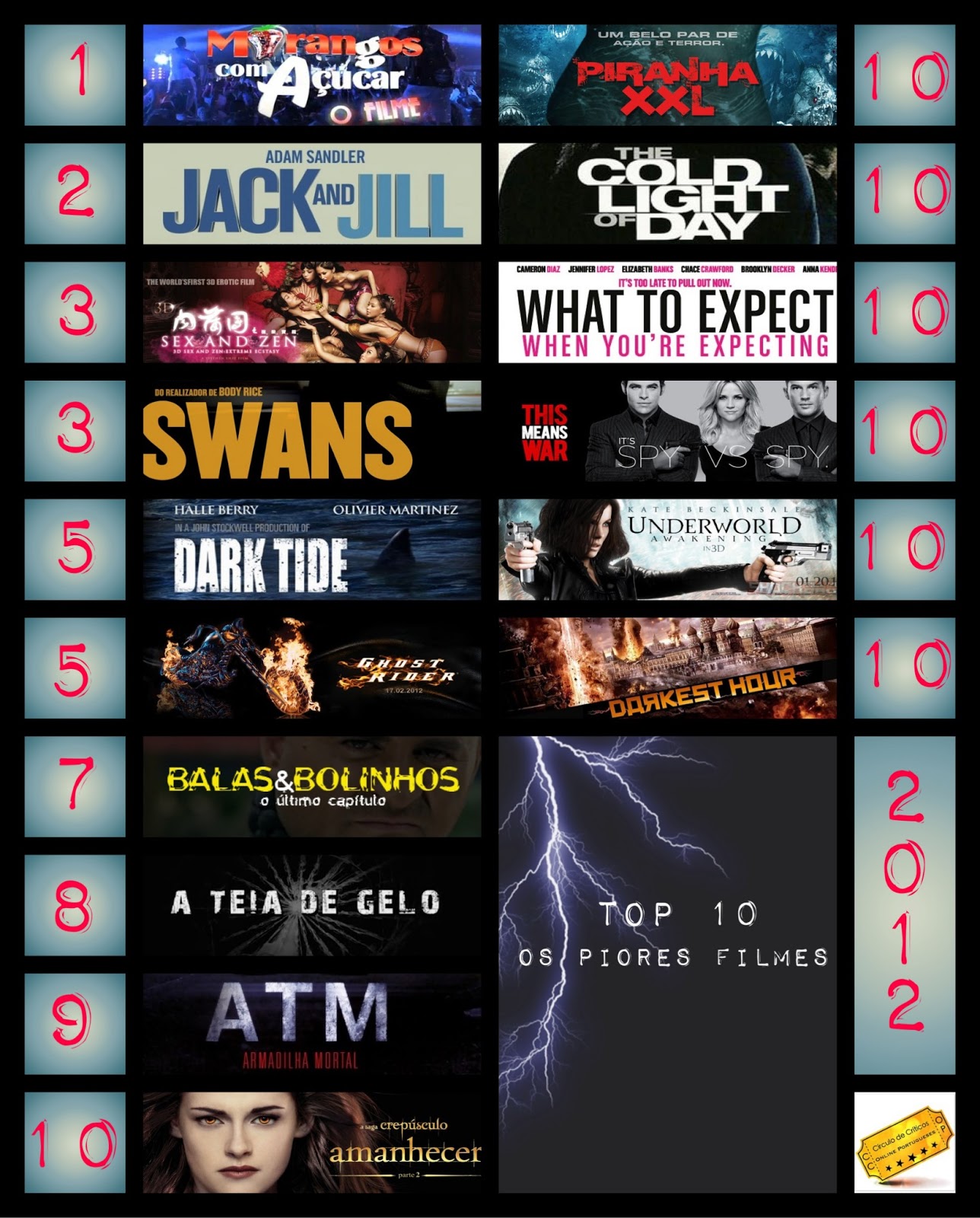 O ranking dos piores com três produções portuguesas - "Morangos com Açúcar - o Filme", "Balas e Bolinhos 3" e "A Teia de Gelo" e com os mais que esperados "Twilight: Breaking Dawn - Part II", "Ghost Rider: Spirit of Vengeance" e "Jack & Jill" (filmes feitos para vencer Razzies).