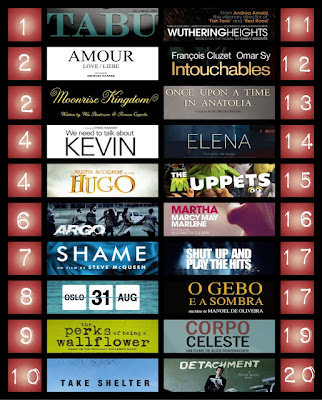 Em relação à lista apurada em Dezembro (prévia à repescagem feita no final de Janeiro), uma melhoria ainda assim importante no ranking dos melhores - ressalve-se a saída de "The Muppets" dos dez melhores e o regresso de "Take Shelter" (bem merecido). A lista bem liderada por "Amour", "Tabu" e "Moonrise Kingdom".